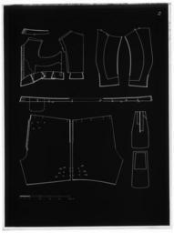 | Keywords: Tröja av sämskskinn. Förmodligen tillverkad av Jehan Beranger, Stockholm - Livrustkammaren - 51599-negative.tif LSH artwork Friderich Feuerbrun pärlstickare Jehan Johan Beranger brodör sv Tröjan av sämskat skinn som tydligen parfymerats av s k innocenttyp med svängd midjelinje 10 skört ståndkrage och relativt korta ärmar med öppna sömmar framtill På grund av det ganska stela och styva materialet eller av att man begagnat sig av ett något urvuxet plagg har man försett det med diverse kilar och tillskarvade stycken Tydligen har man broderat de tillskurna bitarna innan de sedan fogats samman Broderiet är av något annan karaktär än kasackens och byxornas som däremot sinsemellan förefalla likartade I tröjan kan man spåra mer av stramhet Broderiet har sytts icke blott genom lädret utan också genom ett relativt grovt lärftsfoder 17x17 tr/cm2 som lagts mot lädrets insida <br/>Broderiet utgörs även här av en bård Den upptar egentligen ett strängt stiliserat mönster av 16 cm höjd och har nertill vid ytterkanterna begränsats av en repstav och härovanför av en bård som innehåller delar av vad man skulle vilja kalla lambrequinmotiv lagt med repstav Ovanför denna bård följer kompositioner med fruktkorgsmotiv samt palmettarrangering helt symmetriska Allra överst komma dock tulpanliknande blommor som böja sig varannan gång åt höger varannan gång åt vänster Rakt ovanför lambrequinmotivet sitter en liten symmetrisk 7-bladig palmett <br/>Anmärkningsvärt är att man tydligen på tröjan sedan de broderade läderstyckena monterats broderat små kantiljer utanför sömmen d v s i mönstrets fortsättning på det andra läderstycket På ärmarna har man t o m broderat ett ca 4 á 5 cm brett parti i något klumpigare utförande på det nedersta ärmstycket Här kan observeras att man genomgående glömt att göra stycket spegelvänt i förhållande till den intilliggande fruktkorgen Mönstret är för övrigt otroligt väl anpassat till bårdens bredd så att dess proportioner växla på det mest följsamma sätt Lädrets sömmar är hopkastade från baksidan med ca 6stygn/cm samt åt motsatt håll med ca 2 långa kaststygn sytt med 2-trådig högertvinnad grå lintråd I själva broderiet som sytts genom läder och linnefoder har man t ex tagit 9 stygn på en sträcka av 1 cm längd när man sytt ner paljettsträngen Man har använt olikfärgat silke grått gult brunt - med mellannyanser - samt rosa och halmgult <br/>Ett speciellt påpekande bör göras angående skörtens broderier Här har man nämligen förminskat mönstret till mindre rapport och endast broderat små blommor och ornament men likväl behållit lambrequinbården som även den förminskats Man kan lägga märke till delsatt när den 4 5 cm breda spetsen som sytts på skörtens 3 fria sidor denna sitter så långt in på broderiet att lambrequinbården helt döljs dels att man genomgående klippt fodertyget brokaden på baksidan något större än det broderade läderskörtet Dessutom har man på vänstra sidans främsta skört klippt av dess bakre sida vertikalt mitt i broderiet - man har tydligen från början broderat på ett alltför stort skörtstycke Blott en del skört har fått det yttersta snoddbandet som ingår i dekoren placerat på de 3 yttersidorna <br/>Kragen har broderier endast på höger sida ca 9 cm från framkanten räknat På vänster sida går däremot dessa ej ut från kanten utan ca 1 5 cm därifrån och omkring 8 cm åt sidan Det är en ståndkrage med ett 60-tal vertikala avsyningar över de 2 i det grova lärftsfodret 19x18 tr/cm2 horisontellt inlagda lång fiskbenen Dess söm bak ligger inte helt i mitten utan någon cm mer åt höger Upptill är den kantad med ett numera mycket trasigt grått ripsband och har haft vitt taftfoder på insidan Längs den raka framkanten knäpps tröjan med 22 st knappar ca 1 2 cm i diameter varav den 6 e uppifrån saknas Dessutom finns i ståndkragen 3 knappar av samma sort och lika många tränsar av guld- och silvertråd Ärmarna saknar nertill vid uppslagen knappar och knapphål och skiljer sig härigenom från flertalet tröjor <br/>På det högra framstycket där knapparna sitter finns en ca 4 5 cm bred knypplad guld- och silverspets med inlagda breda silverlan som nedifrån skörtets yttersta spets och uppåt räknat når till en höjd av 25 cm Härovanför vidtar en betydligt smalare spets blott 2 8cm bred Detta arrangemang verkar vara ursprungligt då man kan finna liknande tillvägagångssätt på andra tröjor På den knapphålsförsedda vänstra sidan saknas spets helt Placeringen av den breda spetsen tyder på att plagget blott skulle vara knäppt t o m det 12 e eller 13 e knapphålet uppifrån räknat Numera kan man göra den iakttagelsen att just dessa knapphål slitits vilket visserligen även skett med det 20 e som dock kantänkas härröra från tidigare utställning <br/>I övrigt har den breda spetsen tydligen suttit runt omkring alla skört Varje skört drar ca 40 cm vid de öppna ärmsömmarna i de öppna ärmuppslagens insidor runt ärmsömmarna på axelsömmarna och 38 cm på vänster framstycke och eventuellt även på kragen Numera finns spetsarna uteslutande kvar på 1 a skörtet på höger sida skörten mitt bak samt det 3 e på vänster sida i bägge ärmarnas långa sprund i ärmuppslaget på vänster ärm runt höger ärm samt vid nedre delen av vänster ärmringning på höger axel och den redan nämnda biten på höger framstycke I midjesömmen under skörten sitter på insidan 6 st byxtampar försedda med vardera 2 hål Den mellersta på höger sida är troligen senare ditsydd eftersom den är klädd med en glesare vävnad med mörkare guldlan De övriga är - som brukligt är - sydda av foderbrokaden <br/>Tröjan är fodrad med s k gyllenduk d v s guldbrokad Den har en vådbredd av minst 50 cm utan stad ca 70x20 tr/cm2 med varp av otvinnat vitt silke Inslaget bildas av tjockare vitt silk