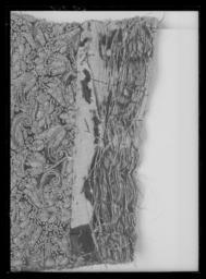 | Keywords: Tröja av svart atlas, 1650-tal - Livrustkammaren - 35809.tif Detta är en dräkt som man mycket gärna skulle vilja sätta i samband med Karl X Gustavs kröning men det finns ännu inget dokumentariskt bevis för detta dräkten ingår ev i fransyska varorna Det är en synnerligen rikt utstyrd dräkt och den har såväl i sitt broderi som i sin foder brokad en ovanligt hög guldhalt I 1671 års inventarium sägs det att dräkten utgörs av kappa tröja byxor knäband skorosor och handskar Allt av svart atlas med Gull heelöfwer borderat Numera är tyvärr dräkten inte längre så fullständig både 1671 och 1676 års inventarier vittnar visserligen om kappans existens men därefter är den försvunnen man hade redan 1671 tagit bort spetsarna av guld och 20 år senare omtalas kappan ej längre Nuvarande inventarium omtalar blott tröja byxor och 1 handske Under ett annat inventarienummer 3435 har emellertid kunnat identifieras ett dräkttillbehör nämligen ett gehäng med samma broderi Den svarta atlasen har en vådbredd av ca 53 cm utan stad Staden är 1 3 cm bred 10 gröna 10 vita 10 gröna 10 vita 10 gröna samt 5 tjocka svarta trådar - tuskaft Trådarnas antal kan variera Det hela ytan täckande broderiet är utfört i läggsöm och har en mönsterrapport av h 10 cm b 6 8 cm Det är utfört med olika sorters guldkantiljer samt paljettsträngar Längs en del kantsömmar har man sytt på ett smalt guldsnöre bestående av en tvinnad tråd omspunnen med lan Broderiet är nersytt med vitt och gult silke samt tjockare rosa lintråd <br/><br/>Analysresultat Tråd och lan av legerat guld huvudbeståndsdelar <br/>Silver xx<br/>Guld xxx<br/>Koppar xxx<br/>Zink 0<br/><br/>Mönstret är ett stiliserat blomstermönster där ett ringformigt omtag snarast utvecklats till en krona som utdragna klockliknande blomkalkar vända sig till eller ifrån I plaggen kan man observera att broderiet uppvisar olika kvaliteter och här kan även spåras skarvar i tyget underlaget De tillskurna bitarna uppvisa en klumpigare torrare karaktär i broderiets utförande samt smärre avvikelser från det gängse utförandet Så t ex har i tröjan den lilla 5-bladiga blomman ovanför kronan sitt översta mellersta blad sytt med horisontella kantiljer istället för vertikala som det borde varit Mönstret är också gyttrigare och oredigare Kronans tinnar är omramade av i öglor lagda konturtrådar och ej som i det ursprungliga broderiet där konturen går upp och ned <br/>Mönsterrapport ca h 77 mm b 58 mm Tröjan av innocenttyp är sydd med 2 framstycken som utökats såväl upptill på axelpartiet som utefter ärmringningen och längs sidosömmen med tillsatta bitar I ryggen har skarvstyckena infogats längs en mittsöm ursprungligen kunde ryggstycket ha varit helt Nu ligger emellertid på ömse sidor mittsömmen en smal blott 1 5 cm bred skarv Likaså har man även baktill gjort tröjan något längre genom skarvar utefter axel- och halsringningarna Ärmarna har bara utvidgats obetydligt genom en skarvad remsa utefter underärmstyckets bakre övre del samt på bägge styckena nertill utefter ytterkantens söm ärmsprundets sida ca 27 cm Kragen har klippts upp på samma sätt som ryggstycket så att intill mittsömmen 2 små skarvstycken ligga på ömse sidor synbarligen även placerade upp- och nedvända Tröjan har 10 skört och i midjesömmen sitta på insidan 8 st byxtampar vardera med 2 hål Fodret utgöres av guldbrokad med svart botten Det har en vådbredd av minst 47 cm ev ca52 x 14 á 15 tr/cm2 Det är en ripsvävnad med varp av svart otvinnat silke Inslagen är 14 st med gult silke högertvinnad med guldlan samt 14 st med gult silke högertvinnad med guldlan samt 14 st svarta med guldlan på rätan Stad ca 1 3 cm 8 gröna 9 vita 12 gröna 8 vita 11 gröna 6 svarta trådar - de färgade i atlasbindning de svarta i lärftsbindning Mönsterrapport h 7 7 cm b 5 8 Mönstret består av halvnaturalistiska små blomsterkvistar <br/><br/>Analysresultat Metalltråd tvinnad med textiltråd huvudbeståndsdelar <br/>Silver xxx<br/>Guld xx<br/>Koppar xx<br/>Zink 0<br/><br/>Då fodret är mycket trasigt och slitet har man fodrat in kragen och den övre delen av tröjan med svart taft Skörten som ju också är fodrade med brokaden har fått bitar av denna på varierande led Man har givetvis velat utnyttja det dyrbara materialet till fullo I framkanten på vänster sida har tröjan en knapphålsrad med 23 knapphål 2 cm långa På motstående sida finns 22 knappar i behåll de är 1 2 cm i diameter Knapphålsraden är på undersidan fodrad med guldbrokad av samma typ som finns i byxornas fickor Nertill i framstyckena finns planschetter som når t o m det 13 e knapphålet eller är ca 22 cm långa Dessa är klädda med något grövre linnelärft än den oblekta linnelärft som utgör mellanfoder i tröjan 23x18 tr/cm2 Det finns 3 knappar med tränsar i ståndkragen Knapparna är överklädda med olika guldtrådar lan och kantiljer I midjan på tröjan har man mellan fodren lagt en avklippt stadremsa vävd randig i gult och orange med svart som ev är en avklippt stad från någon annan dräkts tyg ev den oskurna svarta sammetsdräkten nr 3421 Detta för att ge mera styrsel åt plagget Att man klippt till plaggets olika delar och beräknat sömmarnas placering innan man broderat dem visar bl a ärmarnas nedre parti som på den broderade sidan ju skulle vikas till uppslag De har alltså ej behövt broderas ända ned utan man har lämnat den svarta atlasen bar på ett knappt 10 cm brett stycke Blott mitt fram på högra sidan under knappraden finns en knypplad ca 1 7 cm bred guldspets med guldlan kvar original caption Karl X Gustavs kröning Kristinas kröning Karl X Gustav och Hedvig Eleonoras bröllop 1647 LRK Karl X Gustav av Sverige Modelejon 2002 place of origin original filename LN_B12774_015654 55955 inventory number LRK 19340 35809 CC0 Tröja av svart atlas 1650-tal - Livrustkammaren - 35809-negative tif 