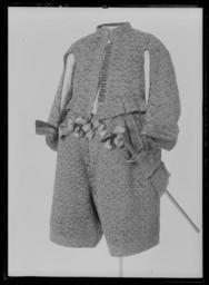 | Keywords: Tröja av svart atlas, 1650-tal - Livrustkammaren - 1746.tif LSH artwork Friderich Feuerbrun pärlstickare David Pärlestickare pärlstickare sv Detta är en dräkt som man mycket gärna skulle vilja sätta i samband med Karl X Gustavs kröning men det finns ännu inget dokumentariskt bevis för detta dräkten ingår ev i fransyska varorna Det är en synnerligen rikt utstyrd dräkt och den har såväl i sitt broderi som i sin foder brokad en ovanligt hög guldhalt I 1671 års inventarium sägs det att dräkten utgörs av kappa tröja byxor knäband skorosor och handskar Allt av svart atlas med Gull heelöfwer borderat Numera är tyvärr dräkten inte längre så fullständig både 1671 och 1676 års inventarier vittnar visserligen om kappans existens men därefter är den försvunnen man hade redan 1671 tagit bort spetsarna av guld och 20 år senare omtalas kappan ej längre Nuvarande inventarium omtalar blott tröja byxor och 1 handske Under ett annat inventarienummer 3435 har emellertid kunnat identifieras ett dräkttillbehör nämligen ett gehäng med samma broderi Den svarta atlasen har en vådbredd av ca 53 cm utan stad Staden är 1 3 cm bred 10 gröna 10 vita 10 gröna 10 vita 10 gröna samt 5 tjocka svarta trådar - tuskaft Trådarnas antal kan variera Det hela ytan täckande broderiet är utfört i läggsöm och har en mönsterrapport av h 10 cm b 6 8 cm Det är utfört med olika sorters guldkantiljer samt paljettsträngar Längs en del kantsömmar har man sytt på ett smalt guldsnöre bestående av en tvinnad tråd omspunnen med lan Broderiet är nersytt med vitt och gult silke samt tjockare rosa lintråd <br/>Analysresultat Tråd och lan av legerat guld huvudbeståndsdelar <br/>Silver xx<br/>Guld xxx<br/>Koppar xxx<br/>Zink 0<br/>Mönstret är ett stiliserat blomstermönster där ett ringformigt omtag snarast utvecklats till en krona som utdragna klockliknande blomkalkar vända sig till eller ifrån I plaggen kan man observera att broderiet uppvisar olika kvaliteter och här kan även spåras skarvar i tyget underlaget De tillskurna bitarna uppvisa en klumpigare torrare karaktär i broderiets utförande samt smärre avvikelser från det gängse utförandet Så t ex har i tröjan den lilla 5-bladiga blomman ovanför kronan sitt översta mellersta blad sytt med horisontella kantiljer istället för vertikala som det borde varit Mönstret är också gyttrigare och oredigare Kronans tinnar är omramade av i öglor lagda konturtrådar och ej som i det ursprungliga broderiet där konturen går upp och ned <br/>Mönsterrapport ca h 77 mm b 58 mm Tröjan av innocenttyp är sydd med 2 framstycken som utökats såväl upptill på axelpartiet som utefter ärmringningen och längs sidosömmen med tillsatta bitar I ryggen har skarvstyckena infogats längs en mittsöm ursprungligen kunde ryggstycket ha varit helt Nu ligger emellertid på ömse sidor mittsömmen en smal blott 1 5 cm bred skarv Likaså har man även baktill gjort tröjan något längre genom skarvar utefter axel- och halsringningarna Ärmarna har bara utvidgats obetydligt genom en skarvad remsa utefter underärmstyckets bakre övre del samt på bägge styckena nertill utefter ytterkantens söm ärmsprundets sida ca 27 cm Kragen har klippts upp på samma sätt som ryggstycket så att intill mittsömmen 2 små skarvstycken ligga på ömse sidor synbarligen även placerade upp- och nedvända Tröjan har 10 skört och i midjesömmen sitta på insidan 8 st byxtampar vardera med 2 hål Fodret utgöres av guldbrokad med svart botten Det har en vådbredd av minst 47 cm ev ca52 x 14 á 15 tr/cm2 Det är en ripsvävnad med varp av svart otvinnat silke Inslagen är 14 st med gult silke högertvinnad med guldlan samt 14 st med gult silke högertvinnad med guldlan samt 14 st svarta med guldlan på rätan Stad ca 1 3 cm 8 gröna 9 vita 12 gröna 8 vita 11 gröna 6 svarta trådar - de färgade i atlasbindning de svarta i lärftsbindning Mönsterrapport h 7 7 cm b 5 8 Mönstret består av halvnaturalistiska små blomsterkvistar <br/>Analysresultat Metalltråd tvinnad med textiltråd huvudbeståndsdelar <br/>Silver xxx<br/>Guld xx<br/>Koppar xx<br/>Zink 0<br/>Då fodret är mycket trasigt och slitet har man fodrat in kragen och den övre delen av tröjan med svart taft Skörten som ju också är fodrade med brokaden har fått bitar av denna på varierande led Man har givetvis velat utnyttja det dyrbara materialet till fullo I framkanten på vänster sida har tröjan en knapphålsrad med 23 knapphål 2 cm långa På motstående sida finns 22 knappar i behåll de är 1 2 cm i diameter Knapphålsraden är på undersidan fodrad med guldbrokad av samma typ som finns i byxornas fickor Nertill i framstyckena finns planschetter som når t o m det 13 e knapphålet eller är ca 22 cm långa Dessa är klädda med något grövre linnelärft än den oblekta linnelärft som utgör mellanfoder i tröjan 23x18 tr/cm2 Det finns 3 knappar med tränsar i ståndkragen Knapparna är överklädda med olika guldtrådar lan och kantiljer I midjan på tröjan har man mellan fodren lagt en avklippt stadremsa vävd randig i gult och orange med svart som ev är en avklippt stad från någon annan dräkts tyg ev den oskurna svarta sammetsdräkten nr 3421 Detta för att ge mera styrsel åt plagget Att man klippt till plaggets olika delar och beräknat sömmarnas placering innan man broderat dem visar bl a ärmarnas nedre parti som på den broderade sidan ju skulle vikas till uppslag De har alltså ej behövt broderas ända ned utan man har lämnat den svarta atlasen bar på ett knappt 10 cm brett stycke Blott mitt fram på högra sidan under knappraden finns en knypplad ca 1 7 cm bred guldspets med guldlan kvar original caption Karl X Gustavs kröning Kristinas kröning Karl X Gustav och Hedvig Eleonoras bröllop 1647 brocade d2 - dräkt - foder material guldbrokad - silk Färg svart d1 - dräkt - yttermaterial material atlas LRK Karl X Gustav av Sverige Modele