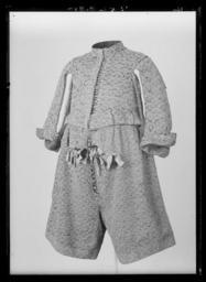 | Keywords: Tröja av svart atlas, 1650-tal - Livrustkammaren - 52705.tif Detta är en dräkt som man mycket gärna skulle vilja sätta i samband med Karl X Gustavs kröning men det finns ännu inget dokumentariskt bevis för detta dräkten ingår ev i fransyska varorna Det är en synnerligen rikt utstyrd dräkt och den har såväl i sitt broderi som i sin foder brokad en ovanligt hög guldhalt I 1671 års inventarium sägs det att dräkten utgörs av kappa tröja byxor knäband skorosor och handskar Allt av svart atlas med Gull heelöfwer borderat Numera är tyvärr dräkten inte längre så fullständig både 1671 och 1676 års inventarier vittnar visserligen om kappans existens men därefter är den försvunnen man hade redan 1671 tagit bort spetsarna av guld och 20 år senare omtalas kappan ej längre Nuvarande inventarium omtalar blott tröja byxor och 1 handske Under ett annat inventarienummer 3435 har emellertid kunnat identifieras ett dräkttillbehör nämligen ett gehäng med samma broderi Den svarta atlasen har en vådbredd av ca 53 cm utan stad Staden är 1 3 cm bred 10 gröna 10 vita 10 gröna 10 vita 10 gröna samt 5 tjocka svarta trådar - tuskaft Trådarnas antal kan variera Det hela ytan täckande broderiet är utfört i läggsöm och har en mönsterrapport av h 10 cm b 6 8 cm Det är utfört med olika sorters guldkantiljer samt paljettsträngar Längs en del kantsömmar har man sytt på ett smalt guldsnöre bestående av en tvinnad tråd omspunnen med lan Broderiet är nersytt med vitt och gult silke samt tjockare rosa lintråd <br/><br/>Analysresultat Tråd och lan av legerat guld huvudbeståndsdelar <br/>Silver xx<br/>Guld xxx<br/>Koppar xxx<br/>Zink 0<br/><br/>Mönstret är ett stiliserat blomstermönster där ett ringformigt omtag snarast utvecklats till en krona som utdragna klockliknande blomkalkar vända sig till eller ifrån I plaggen kan man observera att broderiet uppvisar olika kvaliteter och här kan även spåras skarvar i tyget underlaget De tillskurna bitarna uppvisa en klumpigare torrare karaktär i broderiets utförande samt smärre avvikelser från det gängse utförandet Så t ex har i tröjan den lilla 5-bladiga blomman ovanför kronan sitt översta mellersta blad sytt med horisontella kantiljer istället för vertikala som det borde varit Mönstret är också gyttrigare och oredigare Kronans tinnar är omramade av i öglor lagda konturtrådar och ej som i det ursprungliga broderiet där konturen går upp och ned <br/>Mönsterrapport ca h 77 mm b 58 mm Tröjan av innocenttyp är sydd med 2 framstycken som utökats såväl upptill på axelpartiet som utefter ärmringningen och längs sidosömmen med tillsatta bitar I ryggen har skarvstyckena infogats längs en mittsöm ursprungligen kunde ryggstycket ha varit helt Nu ligger emellertid på ömse sidor mittsömmen en smal blott 1 5 cm bred skarv Likaså har man även baktill gjort tröjan något längre genom skarvar utefter axel- och halsringningarna Ärmarna har bara utvidgats obetydligt genom en skarvad remsa utefter underärmstyckets bakre övre del samt på bägge styckena nertill utefter ytterkantens söm ärmsprundets sida ca 27 cm Kragen har klippts upp på samma sätt som ryggstycket så att intill mittsömmen 2 små skarvstycken ligga på ömse sidor synbarligen även placerade upp- och nedvända Tröjan har 10 skört och i midjesömmen sitta på insidan 8 st byxtampar vardera med 2 hål Fodret utgöres av guldbrokad med svart botten Det har en vådbredd av minst 47 cm ev ca52 x 14 á 15 tr/cm2 Det är en ripsvävnad med varp av svart otvinnat silke Inslagen är 14 st med gult silke högertvinnad med guldlan samt 14 st med gult silke högertvinnad med guldlan samt 14 st svarta med guldlan på rätan Stad ca 1 3 cm 8 gröna 9 vita 12 gröna 8 vita 11 gröna 6 svarta trådar - de färgade i atlasbindning de svarta i lärftsbindning Mönsterrapport h 7 7 cm b 5 8 Mönstret består av halvnaturalistiska små blomsterkvistar <br/><br/>Analysresultat Metalltråd tvinnad med textiltråd huvudbeståndsdelar <br/>Silver xxx<br/>Guld xx<br/>Koppar xx<br/>Zink 0<br/><br/>Då fodret är mycket trasigt och slitet har man fodrat in kragen och den övre delen av tröjan med svart taft Skörten som ju också är fodrade med brokaden har fått bitar av denna på varierande led Man har givetvis velat utnyttja det dyrbara materialet till fullo I framkanten på vänster sida har tröjan en knapphålsrad med 23 knapphål 2 cm långa På motstående sida finns 22 knappar i behåll de är 1 2 cm i diameter Knapphålsraden är på undersidan fodrad med guldbrokad av samma typ som finns i byxornas fickor Nertill i framstyckena finns planschetter som når t o m det 13 e knapphålet eller är ca 22 cm långa Dessa är klädda med något grövre linnelärft än den oblekta linnelärft som utgör mellanfoder i tröjan 23x18 tr/cm2 Det finns 3 knappar med tränsar i ståndkragen Knapparna är överklädda med olika guldtrådar lan och kantiljer I midjan på tröjan har man mellan fodren lagt en avklippt stadremsa vävd randig i gult och orange med svart som ev är en avklippt stad från någon annan dräkts tyg ev den oskurna svarta sammetsdräkten nr 3421 Detta för att ge mera styrsel åt plagget Att man klippt till plaggets olika delar och beräknat sömmarnas placering innan man broderat dem visar bl a ärmarnas nedre parti som på den broderade sidan ju skulle vikas till uppslag De har alltså ej behövt broderas ända ned utan man har lämnat den svarta atlasen bar på ett knappt 10 cm brett stycke Blott mitt fram på högra sidan under knappraden finns en knypplad ca 1 7 cm bred guldspets med guldlan kvar original caption Karl X Gustavs kröning Kristinas kröning Karl X Gustav och Hedvig Eleonoras bröllop 1647 LRK Karl X Gustav av Sverige Modelejon 2002 place of origin original filename LN_B10546_013426 55955 inventory number LRK 19340 52705 CC0 Tröja av svart atlas 1650-tal - Livrustkammaren - 52705-negative tif 