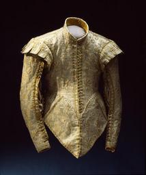 | Keywords: Tröja från 1620-talet - Livrustkammaren - 21721.tif LSH artwork sv Tröjan nämns i Klädkammarens inventarium 1672 <br/> 1 Tröija af gÿllenduuk med gull blommor underfordrat med hwidh lärfft ------50 - <br/>Tröjan är tillverkad av brokad Bottenväven är av vitt silke med lanserade silvertrådar Sex olika typer av blom- och bladfigurer är fördelade över ytan i ett diagonalmönster Dessa är vävda i guldgult silke med glesa guldtrådar som löper två och två med ca 1 5 millimeters mellanrum Mönsterrapporten är 196 x 139 mm <br/>Tröjan är tillverkad i en modell med liv i sex delar framstycken sidstycken och bakstycken Ärmarna är av tvåsömstyp och inramas vid ärmhålet av flikiga axelkarmar Livet avslutas upptill med en ståndkrage och nertill med ett långt skört i åtta delar <br/>Livet <br/>Livets midjelinje avslutas i en spets mitt fram Midjemåttet är 98 cm Framkanterna är ca 44 5 cm långa och löper längs med tygets trådrak Tröjan knäpps mitt fram med 25 st knappar Knapphålen sitter på vänster framstycke De är 18-19 mm långa och inpassade mellan två guldgaloner En som skor ytterkanten och en som löper parallellt med denna Knapphålstränsarna är 3-4 mm breda Knapparna som sitter på höger framstycke är av en rund modell och flätade av guldtråd De är ca 7 mm i diameter 5 mm höga och är fastsydda med en 5 mm hög hals av citrongult silke Knapparna är placerade 4 mm från framkanten och 15-17 mm isär 2 cm från framkanten och parallellt med denna är en guldgalon fastsydd Längst ner i spetsen på vardera framstycket 6 mm från framkanten och 12-13 mm ovanför midjelinjen är ett sytt hål Dessa hål är 8-10 mm i diameter och sydda med kaststygn Hålen hamnar troligen ovan på varandra när tröjan knäpps De främre sidsömmarna är placerade under ärmen och de bakre bildar en diagonal linje mot bakstyckenas sneda sidlinjer De bakre sidsömmarna täcks av guldgaloner Livet har en dekorativ knäppning mitt bak istället för söm En knappslå 2 5-3 cm bred och 36 5 cm lång är fastsydd vid höger bakstycke På denna är 19 st 18-19 mm långa knapphål i citrongult silke Dessa motsvaras av lika många knappar på det vänstra bakstycket Knapparna är ca 11 mm i diameter och välvda till formen De är flätade av glest tvinnade guldsnoddar över en stomme med ett hål i mitten Denna är troligtvis av trä Knappslån är i ytterkant skodd med en guldgalon och sömmen mellan knappslån och bakstycket täcks likaså med en galon Galonerna löper kant i kant med knapphålen på bägge sidor av dessa Där bak- och framstyckena möts vid axelsömmen bildar dessa en spets ut mot axeln Axelsömmen täcks av en guldgalon och ärmhålet är kantat runt om av en galon <br/>Ärmarna <br/>Ärmarna är av tvåsömstyp med en svängd form De är smala vid handleden och rymligare upptill I ärmens innerdel mitt i ärmhålets ringning är ett 5 8 cm djupt sprund i vilket är isatt en 5 5 cm hög och 4 cm bred kil <br/>Ärmens främre söm är till större delen öppen och kan knäppas med 24 st guldknappar av samma typ som i ryggen I vänster ärm saknas en knapp Slitsen i ärmens främre söm börjar 4 cm ovanför ärmfållen och slutar precis vid axelkarmens nedre del ca 7 5 cm från ärmhålet En lös knappslå 2 3 cm bred och 46 2 cm lång är fastsydd i ärmens ytterdel Ärmdelarna är inte ihopsydda ovanför knappslån Knappslån kantas med en guldgalon och har 24 st 18-19 mm långa knapphål i citrongult silke Knapphålen in ramas av kantgalonen och en parallell galon som täcker sömmen mellan knappslån och ytterärmen Knapparna är fastsydda med samma gula silke som i knapphålen De har en ca 2 mm hög hals Ärmens bakre söm avslutas längst ner vid handleden i ett 21 cm långt sprund Sömmen täcks av en guldgalon vilken viks lätt om ytterärmens kant där knapphålen börjar och sedan fortsätter längs med ärmfållen runt handleden På knapphålens andra sida löper en likadan galon Den sneddar upp till in under ärmsömmens galon och försvinner nertill in under samma galon vid handleden Sprundet knäpptes ursprungligen med 10 st små knappar av flätad guldtråd Av dessa återstår nu endast fyra på den högra ärmen Knapparna är fästa på ärmens inre del och knapphål av citrongult silke är sydda på den yttre Dessa är 18-19 mm långa och fyller ut hela utrymmet mellan de båda galonerna Knapparna är av samma typ som i knäppningen mitt fram De är fastsydda med en kantilj på toppen När ärmarna sytts fast i livet är ärmkilens bakre del i höjd med sömmen mellan fram- och sidstycket <br/>Axelkarmarna är uppbyggda av 10 st flikar Dessa är bredare upptill så att ärmhålslinjen fylls ut och smalnar av nedtill Axelkarmarnas ytterkanter är formade så att en spets bildas längst ut på axeln på samma sätt som ärmhålet avslutas i en spets Flikarnas bredd varierar i både ovan- och nederkanterna Fliken längst bak i vardera ärmhålet är oproportionerligt bred Flikarna dekoreras av en guldgalon längs med vardera sidan Dessa är placerade 2-3 mm från kanten Flikarna är ihopsydda med varandra i ovankanten till drygt halva sin längd I punkten där sömmen upphör hålls de samman av en träns Tränarna är utförda i citrongult silke De är ca 2 mm breda och klädda med knapphålsstygn med knutarna vända ut från axeln Flikarna är tillskurna i inslagsriktning De är vikta i den linje som bildar axelkarmens ytterkant och tyget fortsätter på baksidan upp ovanför silkestränsarna Ovanför dessa är baksidan fodrad med citrongul sidentaft troligen slutar brokaden under fodret Sidenfodret är fastsytt med glesa prickstygn Guldgalonen på axelkarmarnas flikar är påsydd efter att dessa sytts samman men innan de fodrats Galonen är inte avklippt utan löper i ett Den vänder i ett V-format veck på axelkarmens baksida i höjd med tränsarna och fortsätter upp på nästa flik <br/>Kragen <br/>Kragen är tillsku