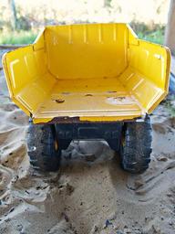 Keywords: truck yellow toy dump truck sand wheels tray driving play child childhood colorful vehicle day outdoor dirty playful game fun construction sandpit boy