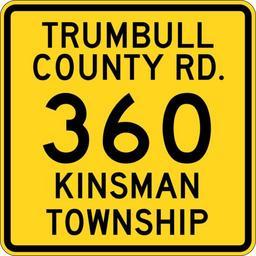 | Keywords: Trumbull County Route 360 OH.svg Kinsman Township as seen at http //www alpsroads net/roads/oh/oh_7/1 htmlhttp //www angelfire com/oh5/countysigns/trumbull_county htmlhttp //www flickr com/photos/dougtone/4100979761/ Based on File Trumbull County OH template svg 2013-06-30 01 12 41 own Minh Nguyen cc-zero Kinsman Township Trumbull County Ohio Diagrams of route markers of Trumbull County Ohio Diagrams of county route markers with county name 0360 360 number | ||||