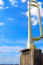 Keywords: trumpet copper music musical instrument sky blue cloudy sky