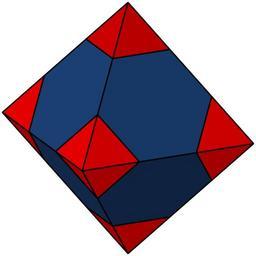 Keywords: Truncated Octahedron with Construction.svg A diagram showing how an en octahedron is made into a truncated octahedron blue by removing square pyramids from each face red Own 07/05/2008 Inductiveload Truncated octahedron