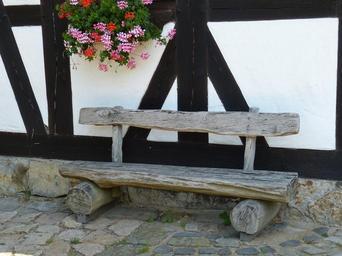 Keywords: truss fachwerkhaus wood bank relax resting after work geranium summer
