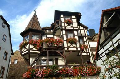 Keywords: truss home facade old town architecture flower box balcony plants old building