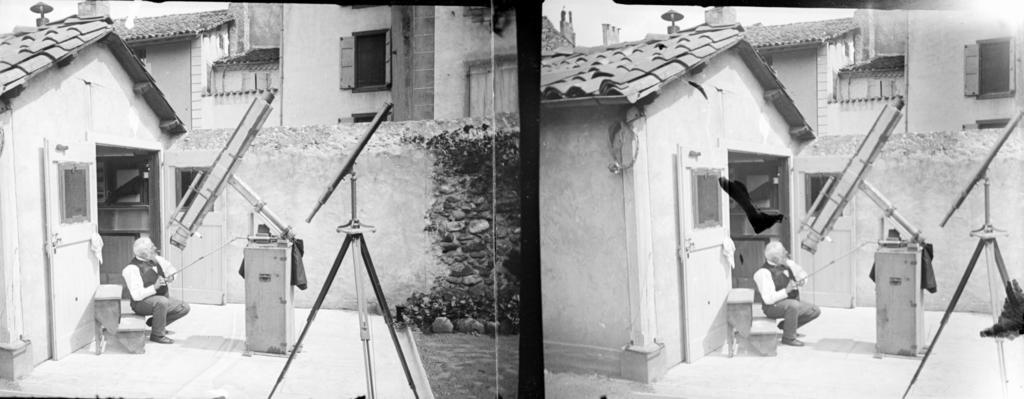 | Keywords: bibliothèque de toulouse bibliothèquedetoulouse man homme telescope télescope eclipse maison astronomie terrasse blackandwhite monochrome black and white Fonds Trutat - Photographie ancienne Cote : TRU C 426 Localisation : Fonds ancien Original non communicable Titre : Eclipse du 30 août 1905, Foix Auteur : Trutat, Eugène Rôle de l’auteur : Photographe Lieu de création : Foix (Ariège) Date de création : : 1905 Mesures : 11 x 5 cm Mot(s)-clé(s) : -- Bâtiment -- Maison -- Cour -- Homme -- Instrument d'optique -- Télescope -- Foix (Ariège) -- Ariège (France ; vallée) -- Pyrénées (France) -- 20e siècle, 1e quart Médium : Photographies Médium : Positifs sur plaque de verre -- Noir et blanc -- Stéréogrammes -- Scènes numerique.bibliotheque.toulouse.fr/cgi-bin/library?c=phot... Bibliothèque de Toulouse. Domaine public Fonds Trutat - Photographie ancienne Cote : TRU C 426 Localisation : Fonds ancien Original non communicable Titre : Eclipse du 30 août 1905, Foix Auteur : Trutat, Eugène Rôle de l’auteur : Photographe Lieu de création : Foix (Ariège) Date de création : : 1905 Mesures : 11 x 5 cm Mot(s)-clé(s) : -- Bâtiment -- Maison -- Cour -- Homme -- Instrument d'optique -- Télescope -- Foix (Ariège) -- Ariège (France ; vallée) -- Pyrénées (France) -- 20e siècle, 1e quart Médium : Photographies Médium : Positifs sur plaque de verre -- Noir et blanc -- Stéréogrammes -- Scènes numerique.bibliotheque.toulouse.fr/cgi-bin/library?c=phot... Bibliothèque de Toulouse. Domaine public Fonds Trutat - Photographie ancienne