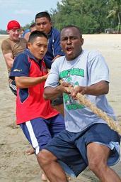 | Keywords: Tug-of-War sports day DVIDS102274.jpg en Operation Specialist 1st Class Freddie Foster assigned to the amphibious dock landing ship USS Toruga teams with members of the Royal Malaysian navy to compete in a tug-of-war at sports day during the Malaysian phase of Cooperation Afloat Readiness and Training 2008 CARAT is an annual series of bilateral maritime training exercises involving the U S and six Southeast Asia nations designed to build relationships and enhance operational readiness 2008-07-09 Chief Petty Officer Steve Vasquez https //www dvidshub net/image/102274 080709-N-+++++-075 2008-07-11 15 28 KUANTAN MY PD-USGov-Military-Navy Cooperation Afloat Readiness and Training 2008 Images from DoD uploaded by Fæ |