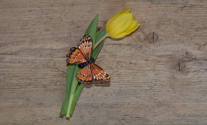 Keywords: tulip flower schnittblume yellow blossom bloom deco butterfly wood
