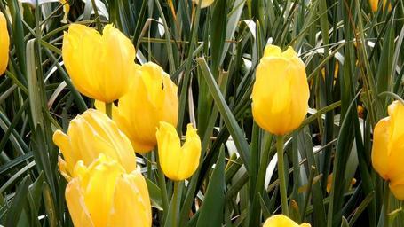 Keywords: tulips yellow flowers blooms blooming buds flowering plants green leaves wild thick dense leafy fleurs gloral fields bright spring