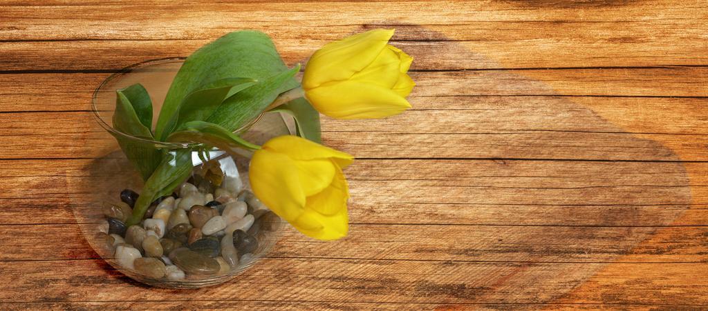 Keywords: tulips yellow flowers spring flowers vase glass decorative stones wood deco close