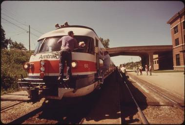 | Keywords: TURBOLINER ENGINE'S WINDSHIELD IS CLEANED AS THE PASSENGER TRAIN IS STOPPED AT BLOOMINGTON, ILLINOIS, ENROUTE FROM... - NARA - 556063.jpg Scope and content General notes 556063 Local identifier 412-DA-13611 Environmental Protection Agency 12/02/1970 - NARA-Author O'Rear Charles 1941- Photographer 3403717 <br /> Bloomington McLean Illinois United States North and Central America inhabited place 3321928 40 483 -88 983 <br /> Still Picture Records Section Special Media Archives Services Division NWCS-S National Archives at College Park 8601 Adelphi Road College Park MD 20740-6001 06/1974 Record group Record Group 412 Records of the Environmental Protection Agency 1944 - 2006 Record group ARC 708 DOCUMERICA The Environmental Protection Agency's Program to Photographically Document Subjects of Environmental Concern compiled 1972 - 1977 Series ARC 542493 File unit File unit ARC Variant control numbers Agency-Assigned Identifier 227/51/013611<br /> NAIL Control Number NWDNS-412-DA-13611 Other versions <gallery> File TURBOLINER_ENGINE'S_WINDSHIELD_IS_CLEANED_AS_THE_PASSENGER_TRAIN_IS_STOPPED_AT_BLOOMINGTON _ILLINOIS _ENROUTE_FROM _-_NARA_-_556063 tif tif File TURBOLINER_ENGINE'S_WINDSHIELD_IS_CLEANED_AS_THE_PASSENGER_TRAIN_IS_STOPPED_AT_BLOOMINGTON _ILLINOIS _ENROUTE_FROM _-_NARA_-_556063 jpg jpg </gallery> NARA-cooperation PD-USGov Turboliner Amtrak Class RTG Bloomington station Chicago Alton Railroad 1974 in Illinois NARA images of Illinois Amtrak in 1974 June 1974 in the United States |