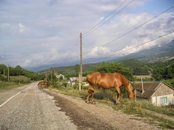 Keywords: turkey horses road mountains landscape scenic grazing eating animals sky clouds forest trees woods valley nature outside summer spring country countryside houses