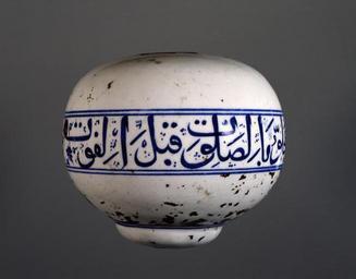 | Keywords: Turkish - Iznik Fritware Mosque Sphere - Walters 481022 - Profile.jpg Islamic religious buildings traditionally were lit with glass lamps generally called mosque lamps that hung from chains In 16th-century Turkey it was common to make mosque lamps from glazed ceramic and to pair them with round or oval ornaments Such ceramic pieces were of little use as lighting fixtures They may have functioned however as acoustic devices hung in groups to soften the echo of voices in the prayer hall Mosque lamps were also symbols of divine light and therefore of God's presence in the place of prayer while the ornamental spheres symbolized the orb of heaven This piece once hung with a lamp possibly in either the mosque or mausoleum of Sultan Selim I in Istanbul The inscription around the body of the sphere is a hadith or saying attributed to the prophet Muhammad The world is only one hour so hasten to prayer before dying and hasten to repent before death early Other date century 16 Ottoman gilt on fritware with underglaze blue decoration cm 13 15 1 h x diam accession number 48 1022 27801 Henry Walters Baltimore date and mode of acquisition unknown Walters Art Museum Henry Walters Acquired by Henry Walters Translation The world is only one hour so hasten to prayer before dying and hasten to repent before death The Here and the Hereafter Images of Paradise in Islamic Art Asia Society New York; Hood Museum of Art Hanover; Bowdoin College Museum of Art Brunswick; University Art Gallery University of California Berkeley Berkeley; Springfield Museums Springfield 1991 place of origin Iznik Turkey Walters Art Museum license Islamic art in the Walters Art Museum Art from Turkey Media contributed by the Walters Art Museum needs category review İznik ceramics |