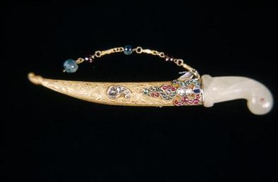 | Keywords: Turkish - Miniature Sword (shamshir) - Walters 5180.jpg These three miniature daggers 51 79 51 80 and 51 81 fit inside a compartment in the butt of the rifle between 1601 1602 Early Modern steel inlaid with gold and rubies blade ; serpentine gilded brass rubies hilt ; gilded brass diamonds emeralds rubies garnets sheath cm 12 2 0 9 1 9 ; with chain of scabbard extended cm 3 w accession number 51 80 4497 R S Pardo Constantinople Henry Walters Baltimore 1903 mode of acquisition unknown Walters Art Museum Henry Walters Acquired by Henry Walters 1903 Translation God's protection place of origin Turkey Walters Art Museum license Islamic art in the Walters Art Museum Weapons in the Walters Art Museum Art from Turkey |