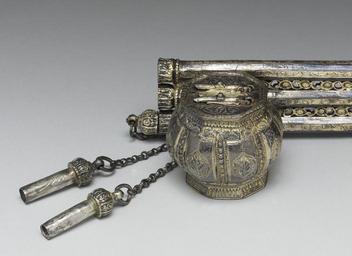 | Keywords: Turkish - Penbox and Inkwell - Walters 57627 - Detail A.jpg The central role of writing in Islamic societies led to calligraphy becoming the most important visual art form Portable pen cases Turkish divit were made with great care and became objects of art themselves Examples from the Ottoman lands are characterized by pronounced end pieces with an inkwell and a tubular arm that held the pens Such pieces were often hinged and had a metal loop for attachment to a belt This parallels the belt-attachable design of the Japanese yatate found elsewhere in this room The yatate and divit elevated pen cases to the status of wearable works of art century 18 Early Modern silver with gilt and niello cm 4 45 5 72 23 18 accession number 57 627 39988 Henry Walters Baltimore date of acquisition unknown by purchase Walters Art Museum Henry Walters Acquired by Henry Walters The World of Islam Saint Mary's College St Mary's City 1981 Illuminated Manuscripts Masterpieces in Miniature The Walters Art Gallery Baltimore 1984-1985 Islamic Culture and the Medical Arts National Library of Medicine Bethesda 1994 Poetry and Prayer Islamic Manuscripts from the Walters Art Museum The Walters Art Museum Baltimore 2010 place of origin Istanbul Turkey Walters Art Museum license Islamic metalwork in the Walters Art Museum Art from Turkey Media contributed by the Walters Art Museum needs category review |