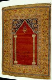 | Keywords: Turkish - Prayer Rug - Walters 811.jpg During their daily prayers Muslims traditionally roll out small rugs to cover the ground creating a ritually clean space for their devotions Likewise the floors of mosques which are places of communal worship are covered with carpets on which Muslims perform their sequence of prayers Islamic prayer rugs vary enormously in decoration but they frequently feature a framed panel with twin columns supporting an arch that represents the mihrab or niche in the wall of a mosque indicating the direction of prayer toward Mecca With this 18th-century rug the worshiper would see the arched form- and thus be reminded of Mecca- when looking down in prayer century 18 Ottoman wool pile wool warp and weft cm 170 122 5 accession number 81 1 19583 Henry Walters Baltimore date and mode of acquisition unknown Walters Art Museum Henry Walters Acquired by Henry Walters place of origin Ghiordes Turkey Walters Art Museum license Islamic art in the Walters Art Museum Textiles in the Walters Art Museum Art from Turkey Ottoman carpets Prayer rugs |