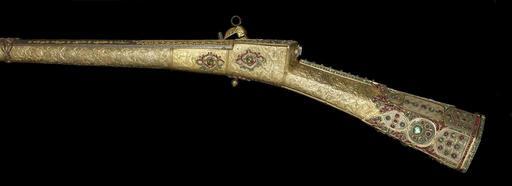 | Keywords: Turkish - Rifle - Walters 5184 - Detail A (2) (3).jpg Referencing the elite pastimes of hunting and writing this ceremonial jeweled rifle set includes a dagger pen case penholder with pen penknife cleaner and a spoon-all conveniently housed within the rifle butt Penknives were important elements in the calligrapher's toolset and their handles were often elaborately decorated The hardness of the reed used for pens throughout Islamic lands required a good blade to make a clean cut The small spoon was used to put black powder into the flash pan in preparation for firing the rifle The imperial monogram tughra of the Ottoman ruler Sultan Mahmud I r 1730-54 is inscribed in diamonds inside the hinged panel of the rifle butt The artist Muhammad and the rifle's owner Ahmad Khan who had possession of the rifle at some point are also named 1732-33 Early Modern rifle steel wood gold gilded silver gilded brass silver nephrite diamonds emeralds rubies or spinels ; dagger steel inlaid with gold rubies and beryls cm 24 8 139 7 7 accession number 51 84 22655 R S Pardo Constantinople date and mode of acquisition unknown Henry Walters Baltimore 1903 mode of acquisition unknown Walters Art Museum Henry Walters Acquired by Henry Walters 1903 Translation on barrel What God wills on flintlock Work of Muhammad; its owner is Ahmad Khan tughra hidden under panel in stock is that of Sultan Mahmud I r 1730-1754 place of origin Turkey <gallery> File Turkish - Rifle - Walters 5184 - Detail A jpg File Turkish - Rifle - Walters 5184 - Detail A 2 jpg </gallery> Walters Art Museum license Tüfeks Islamic metalwork in the Walters Art Museum Weapons in the Walters Art Museum Art from Turkey |