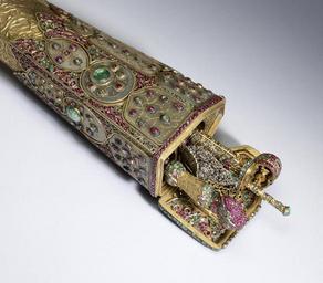 | Keywords: Turkish - Rifle - Walters 5184 - Detail B (2).jpg Referencing the elite pastimes of hunting and writing this ceremonial jeweled rifle set includes a dagger pen case penholder with pen penknife cleaner and a spoon-all conveniently housed within the rifle butt Penknives were important elements in the calligrapher's toolset and their handles were often elaborately decorated The hardness of the reed used for pens throughout Islamic lands required a good blade to make a clean cut The small spoon was used to put black powder into the flash pan in preparation for firing the rifle The imperial monogram tughra of the Ottoman ruler Sultan Mahmud I r 1730-54 is inscribed in diamonds inside the hinged panel of the rifle butt The artist Muhammad and the rifle's owner Ahmad Khan who had possession of the rifle at some point are also named 1732-33 Early Modern rifle steel wood gold gilded silver gilded brass silver nephrite diamonds emeralds rubies or spinels ; dagger steel inlaid with gold rubies and beryls cm 24 8 139 7 7 accession number 51 84 22655 R S Pardo Constantinople date and mode of acquisition unknown Henry Walters Baltimore 1903 mode of acquisition unknown Walters Art Museum Henry Walters Acquired by Henry Walters 1903 Translation on barrel What God wills on flintlock Work of Muhammad; its owner is Ahmad Khan tughra hidden under panel in stock is that of Sultan Mahmud I r 1730-1754 place of origin Turkey <gallery> File Turkish - Rifle - Walters 5184 - Detail B jpg </gallery> Walters Art Museum license Islamic metalwork in the Walters Art Museum Weapons in the Walters Art Museum Firearms of the Ottoman Empire Art from Turkey Media contributed by the Walters Art Museum needs category review |