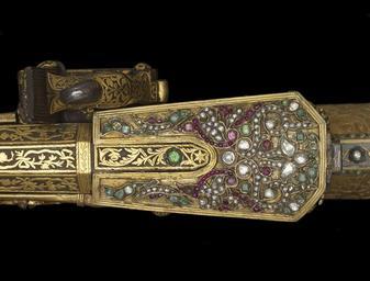 | Keywords: Turkish - Rifle - Walters 5184 - Detail D.jpg Referencing the elite pastimes of hunting and writing this ceremonial jeweled rifle set includes a dagger pen case penholder with pen penknife cleaner and a spoon-all conveniently housed within the rifle butt Penknives were important elements in the calligrapher's toolset and their handles were often elaborately decorated The hardness of the reed used for pens throughout Islamic lands required a good blade to make a clean cut The small spoon was used to put black powder into the flash pan in preparation for firing the rifle The imperial monogram tughra of the Ottoman ruler Sultan Mahmud I r 1730-54 is inscribed in diamonds inside the hinged panel of the rifle butt The artist Muhammad and the rifle's owner Ahmad Khan who had possession of the rifle at some point are also named 1732-33 Early Modern rifle steel wood gold gilded silver gilded brass silver nephrite diamonds emeralds rubies or spinels ; dagger steel inlaid with gold rubies and beryls cm 24 8 139 7 7 accession number 51 84 22655 R S Pardo Constantinople date and mode of acquisition unknown Henry Walters Baltimore 1903 mode of acquisition unknown Walters Art Museum Henry Walters Acquired by Henry Walters 1903 Translation on barrel What God wills on flintlock Work of Muhammad; its owner is Ahmad Khan tughra hidden under panel in stock is that of Sultan Mahmud I r 1730-1754 place of origin Turkey Walters Art Museum license Tüfeks Islamic metalwork in the Walters Art Museum Weapons in the Walters Art Museum Art from Turkey |