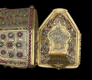 | Keywords: Turkish - Rifle - Walters 5184 - Detail G.jpg Referencing the elite pastimes of hunting and writing this ceremonial jeweled rifle set includes a dagger pen case penholder with pen penknife cleaner and a spoon-all conveniently housed within the rifle butt Penknives were important elements in the calligrapher's toolset and their handles were often elaborately decorated The hardness of the reed used for pens throughout Islamic lands required a good blade to make a clean cut The small spoon was used to put black powder into the flash pan in preparation for firing the rifle The imperial monogram tughra of the Ottoman ruler Sultan Mahmud I r 1730-54 is inscribed in diamonds inside the hinged panel of the rifle butt The artist Muhammad and the rifle's owner Ahmad Khan who had possession of the rifle at some point are also named 1732-33 Early Modern rifle steel wood gold gilded silver gilded brass silver nephrite diamonds emeralds rubies or spinels ; dagger steel inlaid with gold rubies and beryls cm 24 8 139 7 7 accession number 51 84 22655 R S Pardo Constantinople date and mode of acquisition unknown Henry Walters Baltimore 1903 mode of acquisition unknown Walters Art Museum Henry Walters Acquired by Henry Walters 1903 Translation on barrel What God wills on flintlock Work of Muhammad; its owner is Ahmad Khan tughra hidden under panel in stock is that of Sultan Mahmud I r 1730-1754 place of origin Turkey Walters Art Museum license Islamic metalwork in the Walters Art Museum Weapons in the Walters Art Museum Firearms of the Ottoman Empire Art from Turkey Media contributed by the Walters Art Museum needs category review |