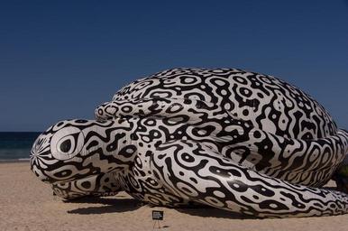 Keywords: turtle giant inflatable sculpture pattern black and white fun art beach sand contemporary modern exhibition blue sky australia