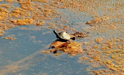 Keywords: turtle stretch legs lake log hang sit float water nature sun bask pond creature amphibian sea weed algae