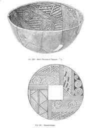 | Keywords: Tusayan bowl.tiff en Fig 290 ”Bowl Province of Tusayan The superb bowl presented in Fig 290 is nearly fifteen inches in diameter and seven inches deep It is hemispherical but not quite symmetrical Having been broken it was mended by its owners after their aboriginal fashion Two pairs of holes have been bored on opposite sides of a long fracture for the insertion of thongs Other perforations have been commenced but do not penetrate the vessel The walls are upwards of one-eighth of an inch in thickness near the rim but are less than that throughout the body of the bowl The paste is of a dark gray color speckled with ashy-white particles which may be pulverized potsherds The interior surface is finished with a slip of white clay 323 and has received a fair degree of polish The exterior is only trowel-finished and is much scarified by use The interior is embellished with a very elaborate design which is given with all possible accuracy in a plain projection in Fig 291 The work does not exhibit a great deal of skill or neatness in execution but the whole design is carefully made out and well adjusted to the deeply concave surface An analysis of this figure is easily given It is a cruciform arrangement of four portions of rather elaborate double borders Each part consists of two parallel 324 bands a principal and a subordinate separated by parallel lines and taking the relation to each other always noticed in the two belts of designs painted upon the exterior of vases Two of the sections are alike The others differ from these and from each other One figure consisting of three linked volutes is defined in white by painting around it a black ground The artist in painting this vessel has probably not thought of achieving anything beyond the filling up neatly of the four spaces and has followed the usual practice of borrowing his motives from other objects; yet it will not be wise to conclude that these figures are really meaningless combinations of lines The persistency and individuality of certain motives makes it almost certain that they are not the result of aimless elaboration and that the potter understood their significance They are too purely geometric however to furnish any clew to us through internal evidence We have no resource beyond the analogies of historic art Modern tribes use the current meander to symbolize water and a leading motive in many of these designs ”the linked scroll running through a field of serrate lines ”is wonderfully like some forms of the Aztec symbol for water as may be seen by reference to the Mexican codices http //www gutenberg org/files/41998/41998-h/41998-h htm p287_dp514 W H Holmes Pottery of the Ancient Pueblos ~ 1883 PD-Old Ancient pueblo people pottery Files uploaded by PDTillman 1880s documents 1880s art |