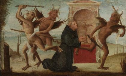 | Keywords: Tuscan School - The Temptation of Saint Nicholas of Tolentino.jpg early other date century 16 early other date century 16 Oil on panel cm 32 4 49 2 object history Franz I Prince von und zu Liechtenstein Duke of Troppau and Jägerndorf Count of Rietberg 1853-1938 by whom acquired in 1931 and by descent; at Gaming Styria from March 1941 to February 1945 when moved to Lauffen bei Ischl where it remained until 3 April 1945 when moved to Reichenau Island Lake Constance until 21 April 1945 when moved to Schloss Vaduz Liechtenstein until the present credit line accession number christies online 5103636 PD-old-100 Paintings of Saint Nicholas of Tolentino Oil on canvas 16th-century paintings Devils in art |