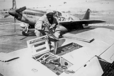 | Keywords: Tuskeegee reload P-51.jpg A USAAF armourer of the 100th Fighter Squadron 332nd Fighter Group 15th U S Air Force checks ammunition belts of the 50 caliber 12 7 mm machine guns in the wings of a North American P-51B Mustang in Italy ca September 1944 The 332nd Fighter Group was composed of Afro-American pilots and ground support personnel trained at Tuskegee Alabama USA and the members of the group became collectively known as the Tuskegee Airmen <br> Original caption An armorer of the 15th U S Air Force checks ammunition belts of the 50 caliber machine guns in the wings of a P-51 Mustang fighter plane before it leaves an Italian base for a mission against German military targets The 15th Air Force was organized for long range assault missions and its fighters and bombers range over enemy targets in occupied and satellite nations as well as Germany itself ca 09/1944 National Archives http //www archives gov/research/african-americans/ww2-pictures/ aaf Pictures of African Americans During World War II http //www archives gov/research/african-americans/ww2-pictures/images/african-americans-wwii-055 jpg image 55 208-MO-18H-32984 ca 1944-09 USAAF PD-USGov 535764 People with ammunition belts Browning AN/M2 Armorers Reloading firearms P-51C Mustang Tuskegee Airmen 332d Fighter Group United States Army Air Forces |