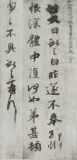 | Keywords: TwentyNinth Wang Xianzhi.JPG en Twenty Ninth day letter Replica of Calligraphy by Wang Xianzhi ACE 344-386 ink on paper 25cm height One part of the collected works handscroll of Wansui Tongtien Tie in Liaoning Province Museum China 廿 日帖 王献之の書 紙 墨書 高25cm 唐時代の模写 万歳 天 帖 巻子 に収録 遼寧 博物館 蔵 Wang family calligraphies copied in Tang dynasty Wen Mu Publishing Beijing 1962-07 唐模王羲之 書翰 1962年7 文物出版社 北京 Wang Xianzhi ACE 344-386 王献之 ACE 344-386 1962-07 PD-Art Chinese calligraphy Chinese cursive script | ||||