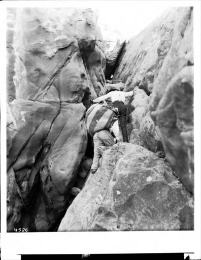 Photograph of two Acoma Indian men climbing up the Acoma Trail, 1886. The steep trial consists of and is surrounded by large rocks. One of the men carries a load wrapped in a blanket on his back. The other man is wearing dark trousers with light suspenders. Their backs are to the camera.