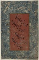 | Keywords: Two Bayts (Verses) on Modesty WDL6851.png Artwork ru Два бейта стиха о ск омности fr Deux bayts versets sur la modestie en Two Bayts Verses on Modesty zh 关于谦 的两个诗节 pt Dois bayts versos sobre a modéstia ar بيتان عن التواضع ru Данный каллиг афический ф агмент состоит из двух <em>бейтов</em> стихов поэзии в кото ых описывается желание неизвестных злодеев сломать или унизить возлюбленную Они хотят сломать ее дикоокую / Они хотят сломать ее че ноокую / Они хотят отделить се дце от души / Они хотят сломать к асоту В этих стихах где неоднок атно повто яется одна ф аза любимые или объекты к асоты <em> кайкулахан </em> буквально носящие загнутые шлемы являются объектом жестокости и в аждебности Текст написанный че ными че нилами письмом насталик на о анжевой бумаге со светло-золотистыми к апинками помещен в золотистую амку и наклеен на бело-синюю отделанную под м амо <em> аб и </em> или <em> эб у </em> бумагу с ка тонной подложкой а ф агменте нет ни даты ни подписи но ш ифт и м амо ная бумага позволяют п едположить что он мог быть написан в И ане или Индии в XVI XVII веках <br>Каллиг афия пе сидская; Иллюмини ование укописей; Пе сидская поэзия; Поэзия fr Ce fragment de calligraphie comprend deux <em>bayts</em> versets de poésie qui décrivent le désir d'antagonistes non identifiés de briser ou d'humilier la bien-aimée « Ils veulent briser celle aux yeux sauvages / Ils veulent briser celle aux sourcils noirs / Ils veulent briser le cœur de l'esprit / Ils veulent briser les objets de beauté » Dans ces versets à phrasé répétitif les bien-aimées ou les objets de beauté - les <em>kajkulahan</em> littéralement « ceux portant des casques tordus » - sont la cible de violence et d'animosité Rédigés en écriture nastaliq à l'encre noire sur un papier orange orné de paillettes d'or clair le texte est encadré de jaune et collé sur un papier bleu et blanc <em>abri</em> ou <em>ebru</em> marbré renforcé par du carton Le fragment n'est ni signé ni daté mais l'écriture et le papier marbré semblent indiquer qu'il pourrait avoir été produit en Iran ou en Inde durant les XVI<sup>e</sup>-XVII<sup>e</sup> siècles <br>Calligraphie persane; Enluminures; Poésie persane; Poésie en This calligraphic fragment includes two <em>bayts</em> verses of poetry that describe the desire of unidentified antagonists to break or humble the beloved They want to break the wild-eyed / They want to break the black-eyelashed / They want to break the heart from the spirit / They want to break the objects of beauty In these verses with repetitive phrasing the beloved ones or objects of beauty the <em>kajkulahan</em> literally the ones wearing crooked helmets are the target of violence and animosity Written in black Nasta'liq script on orange paper decorated with light-gold sprinkles the text is provided with a gold frame and is pasted onto a blue-and-white <em>abri</em> or <em>ebru</em> marbled paper strengthened with cardboard The fragment is neither signed nor dated but the script and the marble paper suggest that it may have been produced in Iran or India during the 16th 17th centuries <br>Calligraphy Persian; Illuminations; Persian poetry; Poetry zh 这幅书法残卷包含两 <em>bayts</em>(句)诗,描述了不明的对手将心爱的人摧折或驯 的渴 : 他们想驯 的 /他们想折断浓密的 毛/他们想要破碎心灵 摧折意志/他们想打击美丽的事物 这些措辞重复的诗句中,心爱的人或美丽的事物 <em>kajkulahan</em>(字 意 为 戴 歪头盔的人 )指的是暴力和敌意对付的目标 此字幅以黑色波斯体书写 装饰 淡金色斑点的橙色纸张上,字幅带 金色边框,粘贴 白色的 <em>abri</em> 或 <em>ebru</em>(大理石纹理)纸张上,以背衬的纸 加固 该书法残卷既没 标注日 也没 署名,但其字体和大理石纹理纸表明,它可能是于 16 至 17 世纪 伊 和印度创 的 <br>书法,波斯语; 插图; 波斯诗歌; 诗歌 pt Este fragmento caligráfico inclui dois <em>bayts</em> versos de poesia que descrevem o desejo de antagonistas não identificados de romper com ou humilhar o ser amado Querem partir aquele de olhos selvagens / Querem partir o de cílios negros / Querem partir o coração do espírito / Querem quebrar os objetos da beleza Nesses versos de fraseamento repetitivo os seres amados ou objetos da beleza os <em>kajkulahan</em> literalmente aqueles que usam capacetes tortos são alvo de violência e de animosidade Escrito em caligrafia nasta'liq preta em papel laranja e decorado com manchas em dourado claro o texto é acompanhado de uma moldura dourada e colado em papel <em>abri</em> ou <em>ebru</em> marmoreado reforçado com cartão O fragmento não foi assinado nem datado mas a caligrafia e o papel marmoreado sugerem que deva ter sido produzido no Irã ou na Índia entre os séculos XVI e XVII <br>Caligrafia persa; Iluminuras; Poesia persa; Poesia ar تتضمن هذه القطعة الخطية <em>بيتين</em> من الشعر يتعلقان برغبة خصوم لم تُحدَّد هويتهم في إذلال أو كسر شوكة المحبوب يريدون إذلال ذات العينين المتوحشتين \ يريدون إذلال 