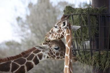 Keywords: two giraffes eating grazing food zoo animal wildlife mammal head neck reticulated african design pattern portrait colorful