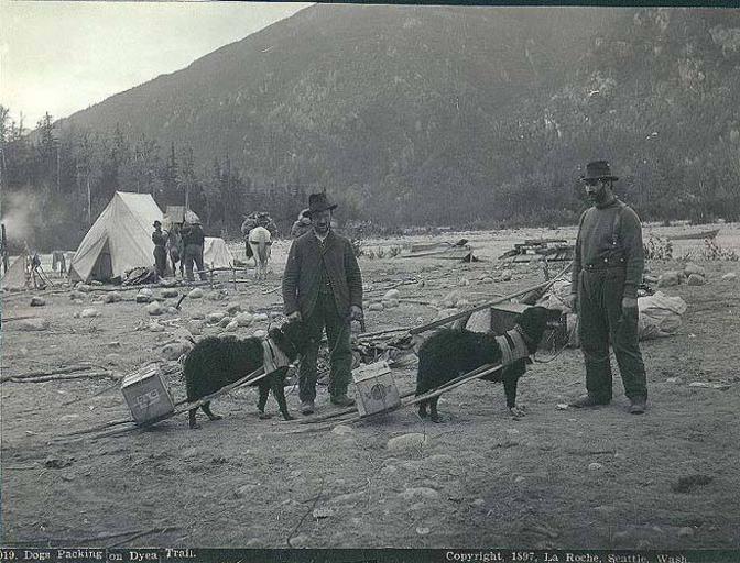 Keywords: Two Klondikers with dogs packing supplies along the Chilkoot Trail near Dyea, Alaska, 1897 (LAROCHE 111).jpeg check categories 8 June 2016 7 Photograph Creator Frank La Roche Caption on image Dogs packing on Dyea Trail c1897 Klondike Gold Rush Dogs are most valuable in winter as they are then attached to sleds and will draw 100 pounds twenty miles or more a day five or six being usually harnessed to each sled Dog teams were found of great service by the many parties who came out from Dawson during the past winter and but for them many would not have been able to make the trip The native dogs of the interior are the most valuable and have sold as high as 200 each in Dawson Car loads of mongrel curs have been shipped into Seattle and other points of departure for Alaska and then trained to work in teams making both day and night hideous with their howlings Frank La Roche En Route to the Klondike 1898 Subjects LCTGM Pack animals--Alaska--Dyea; Tents--Alaska--Dyea; Dogs--Alaska--Dyea; Travois--Alaska--Dyea Subjects LCSH Chilkoot Trail; Trails--Alaska depicted place Dyea Alaska 1897 Institution University of Washington UWASH-LAROCHE-source accession number laroche 111 PD-old-auto-1923 1936 Information field Order Number LAR204 Images from the Frank La Roche Photographs Collection to check Pack animals Tents Dogs of Alaska Travois Chilkoot Trail Trails Dyea Alaska |