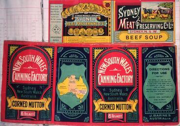 | Keywords: indoor text Sydney Meat Company label shows a group of sheep and cattle, as well as symbols, medals and lettering. Lithographer is Turner & Henderson, Sydney. New South Wales Canning Factory shows text, lettering, and a map of Australia. J Barnes is the proprietor of the company. The lithgrapher's name is not given. Quantity: 2 colour art print(s) on labels.. Physical Description: Chromolithographs, on labels: approx 95 x 320 mm; and, approx 135 x 335 mm (slightly curved) Provenance: Deposited by Gear Meat Company in 1981. Turner & Henderson Company. [Two labels] :Sydney Meat Preserving Company Ltd, Sydney, N.S.W. Beef soup; and, New South Wales Canning Factory (Sydney). Corned mutton. [Both 1890-1920?].. Gear Meat Company :Scrapbook of labels. 1890s-1920s].. Ref: Eph-F-MEAT-Gear-122. Alexander Turnbull Library, Wellington, New Zealand. natlib.govt.nz/records/23082100 Sydney Meat Company label shows a group of sheep and cattle, as well as symbols, medals and lettering. Lithographer is Turner & Henderson, Sydney. New South Wales Canning Factory shows text, lettering, and a map of Australia. J Barnes is the proprietor of the company. The lithgrapher's name is not given. Quantity: 2 colour art print(s) on labels.. Physical Description: Chromolithographs, on labels: approx 95 x 320 mm; and, approx 135 x 335 mm (slightly curved) Provenance: Deposited by Gear Meat Company in 1981. Turner & Henderson Company. [Two labels] :Sydney Meat Preserving Company Ltd, Sydney, N.S.W. Beef soup; and, New South Wales Canning Factory (Sydney). Corned mutton. [Both 1890-1920?].. Gear Meat Company :Scrapbook of labels. 1890s-1920s].. Ref: Eph-F-MEAT-Gear-122. Alexander Turnbull Library, Wellington, New Zealand. natlib.govt.nz/records/23082100 |