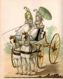 | Keywords: Two Ladies, en neglige, taking an airing in a phaeton - The Gallery of Fashion, August 1794.jpeg Two Ladies en neglige taking an airing in a phaeton Left lady Headdress white stamp- paper hat trimmed with a green riband and tied down with the same One green and one yellow feather placed on the left side Green gauze veil The hair in small curls; plain chignon Plain calico morning dress with long sleeves; the petticoat trimmed with a narrow flounce Plain lawn handkerchief green sash lawn cloak trimmed with lace and tied behind york tan gloves yellow shoes Right lady Headdress straw-coloured hat trimmed with orange and purple ribands and a white lawn handkerchief embroidered in lilac tied down with a white riband One lilac and white cross-striped large ostrich feather on the left side the hair in light curls and hanging down in ringlets behind bound with a half-handkerchief tied into a large bow in the front Chemise of spotted muslin trimmed with a double plaiting of broad lace about the waist tied in front by a lilac riband short loose sleeves tied in the middle with the same riband Lilac-coloured sash tied behind jonquille-coloured gloves and shoes http //regencyfashion org/heid/ND8-1794 html Dresses of August 1794 from The Gallery of Fashion 1794-08 Nikolaus Innocentius Wilhelm Clemens von Heideloff 1761-1837 PD-old-auto-1923 1837 Files uploaded by Darwinius Fashion in 1794 High-perch phaetons Carriages in the United Kingdom Carriages in the 1790s Phaetons in art Gallery of Fashion Morning dresses |