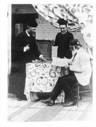 ''Two Los Angeles Plaza church priests with Don Antonio Coronel examining church records, ca.1885-1900