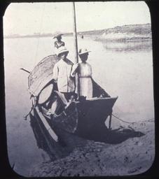 "A small boat like the one owned by Old Tang. The 2 missionaries were colleagues of our parents: Mr. "Wullie" Chapman, and Miss Minta Ellington." Two missionaries are standing in a small boat on the edge of a river bank.; Captions for this set of lantern slides from the papers of Oliver and Jennie Logan, American Presbyterian missionaries in Hunan, were provided by their daughter Elsa.