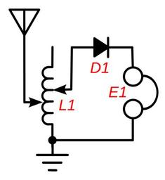 Keywords: Two slider crystal radio circuit.svg Circuit of a two-slider crystal radio receiver a popular circuit used in simple crystal radios made before 1920 To tune in different stations it used a tuning coil L1 with two sliding contacts on it It doesn't use a tuning capacitor instead the coil resonates with the capacitance of the long wire antenna to create a tuned circuit The left-hand slider tunes the receiver to different stations allowing more or less of the coil's turns in parallel with the antenna capacitance The right-hand slider adjusts the impedance match between the antenna and the rest of the circuit to maximise the power transferred from the antenna into the receiver It is adjusted until the station sounds loudest in the earphone E1 The coil acts as an impedance matching transformer to match the low impedance 10-200 ohms of the antenna-ground circuit with the higher impedance thousands of ohms of the coil at resonance The two adjustments were interactive so adjusting the right slider also detuned the radio requiring retuning own Chetvorno I User Chetvorno the author of this work release it into the public domain for any use whatever Crystal radios