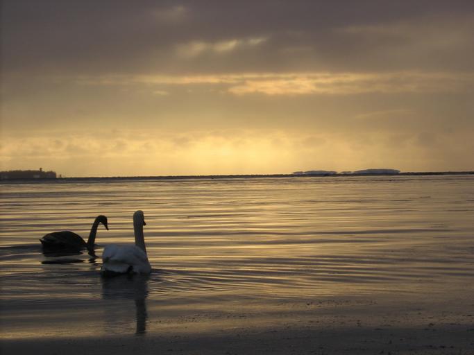 Keywords: two swans swimming sunset lake water waterfowl wildlife serene silhouette