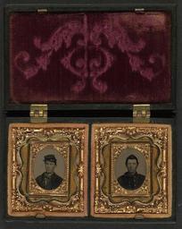 Keywords: library of congress libraryofcongress dc:identifier=http://hdl.loc.gov/loc.pnp/ppmsca.27423 dc:identifier=httphdllocgovlocpnpppmsca27423 xmlns:dc=http://purl.org/dc/elements/1.1/ xmlns:dc=httppurlorgdcelements11 u.s. civil war uscivilwar american civil war americancivilwar the civil war thecivilwar civil war civilwar war between the states warbetweenthestates united states of america unitedstatesofamerica u.s.a. usa the union theunion union the north thenorth yankee yankees soldier soldiers people groupshot indoor [Two unidentified soldiers in Union uniforms] [between 1861 and 1865] 2 photographs in 1 case : gem tintype, hand-colored ; 7.5 x 11.8 cm (case) Notes: Title devised by Library staff. Case: Berg, no. 1-165. Gift; Tom Liljenquist; 2010; (DLC/PP-2010:105). Subjects: United States.--Army.--People--1860-1870. Soldiers--Union--1860-1870. Military uniforms--Union--1860-1870. United States--History--Civil War, 1861-1865--Military personnel--Union. Format: Portrait photographs--1860-1870. Tintypes--Hand-colored--1860-1870. Rights Info: No known restrictions on publication. Repository: Library of Congress, Prints and Photographs Division, Washington, D.C. 20540 USA, hdl.loc.gov/loc.pnp/pp.print Part Of: Ambrotype/Tintype filing series (Library of Congress) (DLC) 2010650518 Liljenquist Family collection (Library of Congress) (DLC) 2010650519 More information about this collection is available at hdl.loc.gov/loc.pnp/pp.lilj Persistent URL: hdl.loc.gov/loc.pnp/ppmsca.27423 Call Number: AMB/TIN no. 2554 [Two unidentified soldiers in Union uniforms] [between 1861 and 1865] 2 photographs in 1 case : gem tintype, hand-colored ; 7.5 x 11.8 cm (case) Notes: Title devised by Library staff. Case: Berg, no. 1-165. Gift; Tom Liljenquist; 2010; (DLC/PP-2010:105). Subjects: United States.--Army.--People--1860-1870. Soldiers--Union--1860-1870. Military uniforms--Union--1860-1870. United States--History--Civil War, 1861-1865--Military personnel--Union. Format: Portrait photographs--1860-1870. Tintypes--Hand-colored--1860-1870. Rights Info: No known restrictions on publication. Repository: Library of Congress, Prints and Photographs Division, Washington, D.C. 20540 USA, hdl.loc.gov/loc.pnp/pp.print Part Of: Ambrotype/Tintype filing series (Library of Congress) (DLC) 2010650518 Liljenquist Family collection (Library of Congress) (DLC) 2010650519 More information about this collection is available at hdl.loc.gov/loc.pnp/pp.lilj Persistent URL: hdl.loc.gov/loc.pnp/ppmsca.27423 Call Number: AMB/TIN no. 2554
