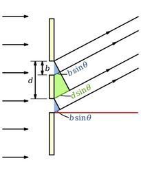 Keywords: Two Wide Slits.svg en A diagram of the path differences in a double wide-slit experiment d is the slit separation b is the slit width Own Inductiveload 2009-05-13 Double-slit experiments