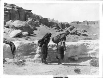 Photograph of two women carrying water from the valley to the pueblo of Mishongnovi (Mashongnavi) atop Second Mesa, Arizona, ca.1898. They stand beside a low dry embankment with pots on their backs slung in cloths from around their heads. The woman on the right carries a small pail as well. They both wear long shirts and skirts and are barefoot. A cloth lies on embankment at left. The pueblo of Mishongnovi is visible in the distance.