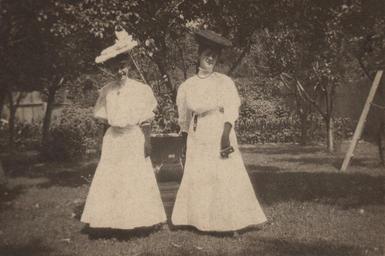 | Keywords: portraits women monochrome Photographer: Reuben R. Sallows (1855 - 1937) Description: Two women standing on either side of an urn filled with flowers in a garden; both women wearing long light dresses with lace collars and three-quarter lengthened mutton sleeves; woman on left wears a light hat, dark gloves and a broach; woman on right wears a dark hat, dark gloves, belt and necklace while holding a small box-shaped purse; trees in background; wooden ladder leans against tree on right; writing in ink on back identifies subjects as Flo Sallows Saunders, Emma Combs Fillman Object ID : 0390-rrs-ogohc-ph View additional photographs by Sallows that are held in other collections at the Reuben R. Sallows Digital Library. Order a higher-quality version of this item by contacting the Huron County Museum (fee applies). Photographer: Reuben R. Sallows (1855 - 1937) Description: Two women standing on either side of an urn filled with flowers in a garden; both women wearing long light dresses with lace collars and three-quarter lengthened mutton sleeves; woman on left wears a light hat, dark gloves and a broach; woman on right wears a dark hat, dark gloves, belt and necklace while holding a small box-shaped purse; trees in background; wooden ladder leans against tree on right; writing in ink on back identifies subjects as Flo Sallows Saunders, Emma Combs Fillman Object ID : 0390-rrs-ogohc-ph View additional photographs by Sallows that are held in other collections at the Reuben R. Sallows Digital Library. Order a higher-quality version of this item by contacting the Huron County Museum (fee applies). |