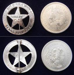 Keywords: TXAS RANGERS-F&B-W.JPG en TEXAS RANGERS current badge and MEXICAN coin own Hartmann352 2009-10-09 Texas Ranger Division Law enforcement badges of Texas