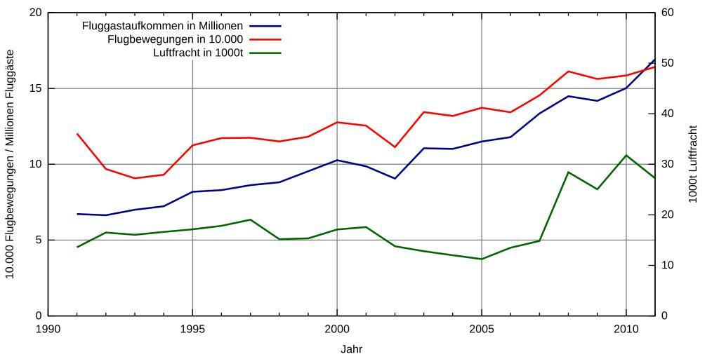 | Keywords: TXL stats.svg  en Berlin Tegel Airport statistical data de Flughafen Berlin-Tegel Verkehrszahlen seit 1991 own ; data from http //www berlin-airport de/DE/UeberUns/Verkehrsstatistik/Monatlich/TXL berlin-airport de Gorgo 2011-02-13 Gnuplot script to generate this plot gnuplot <source lang gnuplot > /usr/bin/gnuplot gnuplot 4 2 / Ubuntu 8 10 input set timefmt Y set datafile separator ; output set key top left set style data lines set grid set xdata time set xlabel 'Jahr' set xrange '1990' '2012' set xtics 157680000 set mxtics 5 set format x ' Y' set ylabel '10 000 Flugbewegungen / Millionen Fluggäste' set ytics nomirror set ytics 5 set yrange 0 20 set y2tics 10 set autoscale y2 set y2range 0 60 set y2label '1000t Luftfracht' set term svg size 800 400 font Arial 10 set output 'TXL_stats svg' plot '-' using 1 2/1000000 title 'Fluggastaufkommen in Millionen' axes x1y1 lt rgb 'dark-blue' lw 2 \ '-' using 1 2/10000 title 'Flugbewegungen in 10 000' axes x1y1 lt rgb 'red' lw 2 \ '-' using 1 2/1000 title 'Luftfracht in 1000t' axes x1y2 lt rgb 'dark-green' lw 2 1991;6715402 1992;6641634 1993;7000168 1994;7234345 1995;8186512 1996;8298736 1997;8622359 1998;8810476 1999;9543437 2000;10268325 2001;9863870 2002;9055002 2003;11055303 2004;11014062 2005;11500454 2006;11787960 2007;13345188 2008;14486610 2009;14180084 2010;15025600 2011;16919820 2012;18164203 e 1991;120344 1992;96896 1993;90750 1994;93103 1995;112521 1996;117247 1997;117495 1998;115092 1999;118188 2000;127668 2001;125484 2002;111334 2003;134395 2004;131875 2005;137288 2006;134322 2007;145423 2008;161237 2009;156262 2010;158570 2011;169384 2012;171114 e 1991;13585 1992;16493 1993;16060 1994;16625 1995;17131 1996;17836 1997;19043 1998;15183 1999;15349 2000;17096 2001;17578 2002;13787 2003;12800 2004;12009 2005;11246 2006;13490 2007;14830 2008;28427 2009;25057 2010;31767 2011;26578 2012;26933 e </source> Cc-zero Statistics of Berlin Tegel Airport Images with Gnuplot source code |