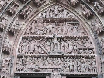| Keywords: Tympanum of western facade of Notre-Dame de Strasbourg (central).jpg en Tympanum of the central entrance on the facade of the cathedral Notre-Dame de Strasbourg France fr Tympan de l'entrée du milieu de la façade de la cathédrale de Notre-Dame de Strasbourg own Tangopaso 2012-12-22 48 581592 7 75038 region FR_heading ENE ImageNote 1 740 1501 519 806 4416 3312 2 Jesus crowned with spines ImageNoteEnd 1 ImageNote 2 1259 1501 767 811 4416 3312 2 Jesus bearing His cross ImageNoteEnd 2 ImageNote 3 2020 1468 684 850 4416 3312 2 Passion of Christ ImageNoteEnd 3 ImageNote 4 2716 1501 1281 811 4416 3312 2 Entombment of Christ ImageNoteEnd 4 ImageNote 5 618 2307 602 773 4416 3312 2 Entrance of Jesus into Jerusalem ImageNoteEnd 5 ImageNote 6 1071 806 453 696 4416 3312 2 Judas hangs himself ImageNoteEnd 6 ImageNote 7 1225 2302 1386 784 4416 3312 2 Last Supper ImageNoteEnd 7 ImageNote 8 2605 2302 1093 789 4416 3312 2 Kiss of Judas and Arrest of Jesus ImageNoteEnd 8 ImageNote 9 3693 2302 403 784 4416 3312 2 Jesus whipped ImageNoteEnd 9 ImageNote 10 1512 171 1733 624 4416 3312 2 Ascension of Christ ImageNoteEnd 10 Tympanum of the central portal of the western facade of Notre-Dame de Strasbourg Sandstone reliefs in Strasbourg Gothic reliefs in Strasbourg 13th-century sandstone reliefs in Alsace Strasbourg Reliefs of Ascension of Christ Strasbourg Reliefs of Judas Iscariot in France Strasbourg Reliefs of the Last Judgment in France Strasbourg Reliefs of Adam and Eve Strasbourg Reliefs of the passion of Jesus Christ in France Strasbourg |