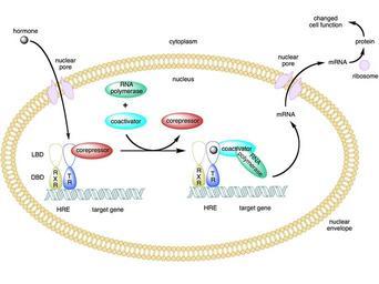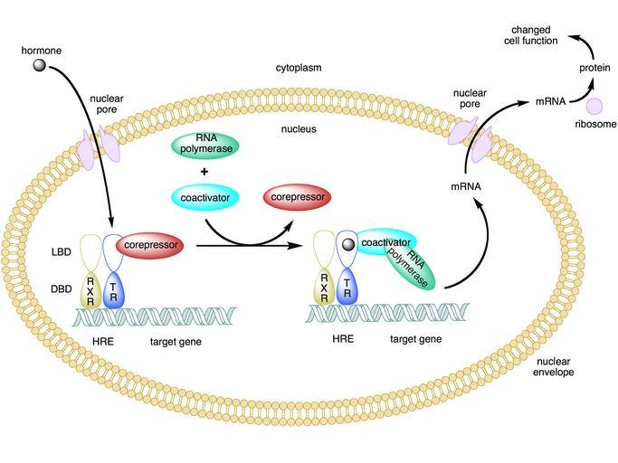 | Keywords: Type ii nuclear receptor action.png en Created myself using CambridgeSoft BioDraw Mechanism nuclear receptor action This figure depicts the mechanism of a class II nuclear receptor NR which regardless of ligand binding status is located in the nucleus bound to DNA For the purpose of illustration the nuclear receptor shown here is the thyroid hormone receptor TR heterodimerized to the RXR In the absence of ligand the TR is bound to corepressor protein Ligand binding to TR causes a dissociation of corepressor and recruitment of coactivator protein which in turn recruit additional proteins such as RNA polymerase that are responsible for transcription of downstream DNA into RNA and eventually protein which results in a change in cell function Own Boghog2 2008-11-30 Acción de receptores nucleares II png Cell diagrams Systems biology Signal transduction |